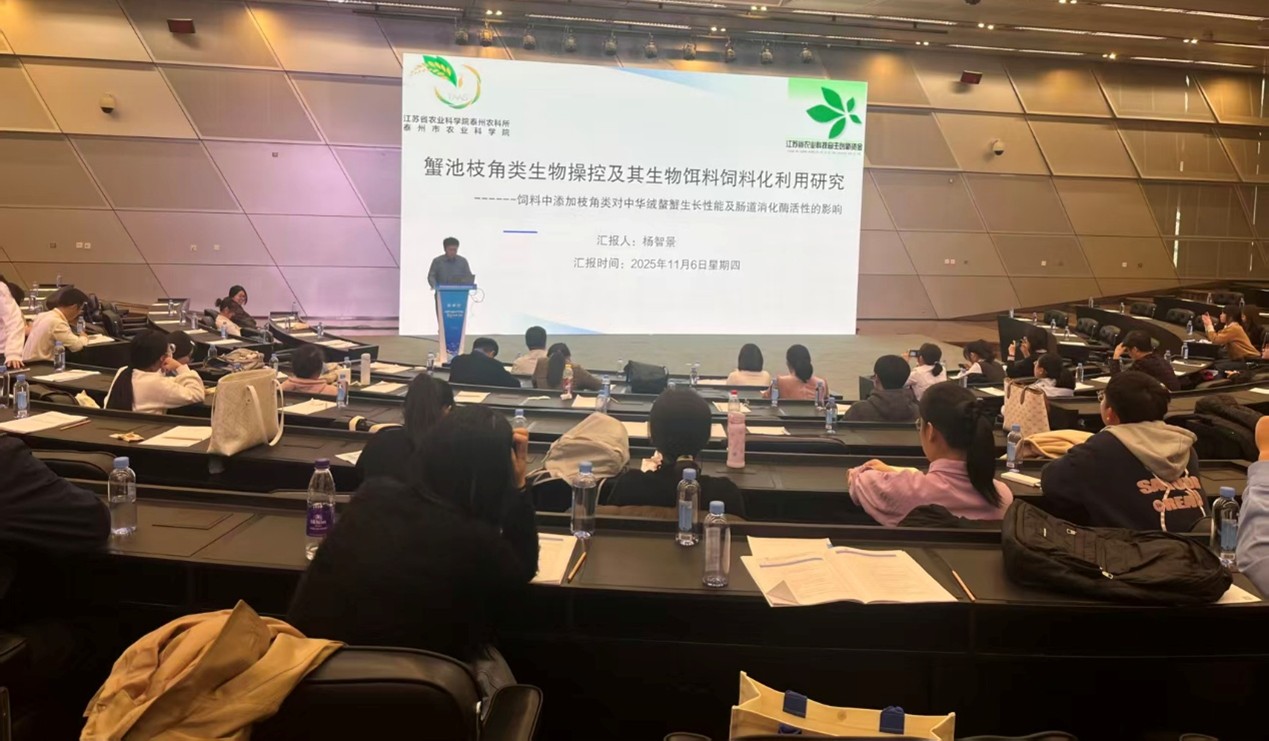 在“水产养殖动物营养与饲料”专题研讨环节,我院特色水产研究室杨智景作了题为“蟹池枝角类生物操控及其生物饵料饲料化利用研究——饲料中添加枝角类对中华绒螯蟹生长性能及肠道消化酶活性的影响”的专题交流。主要围绕枝角类培育和饲料化利用所开展的系统研究,重点介绍了枝角类生物饵料种群构建关键技术和不同枝角类添加剂量对中华绒螯蟹生长性能及肠道消化酶活性的对比分析。该研究为枝角类饲料化利用提供了重要理论依据,为中华绒螯蟹绿色健康养殖提供了技术支撑。
